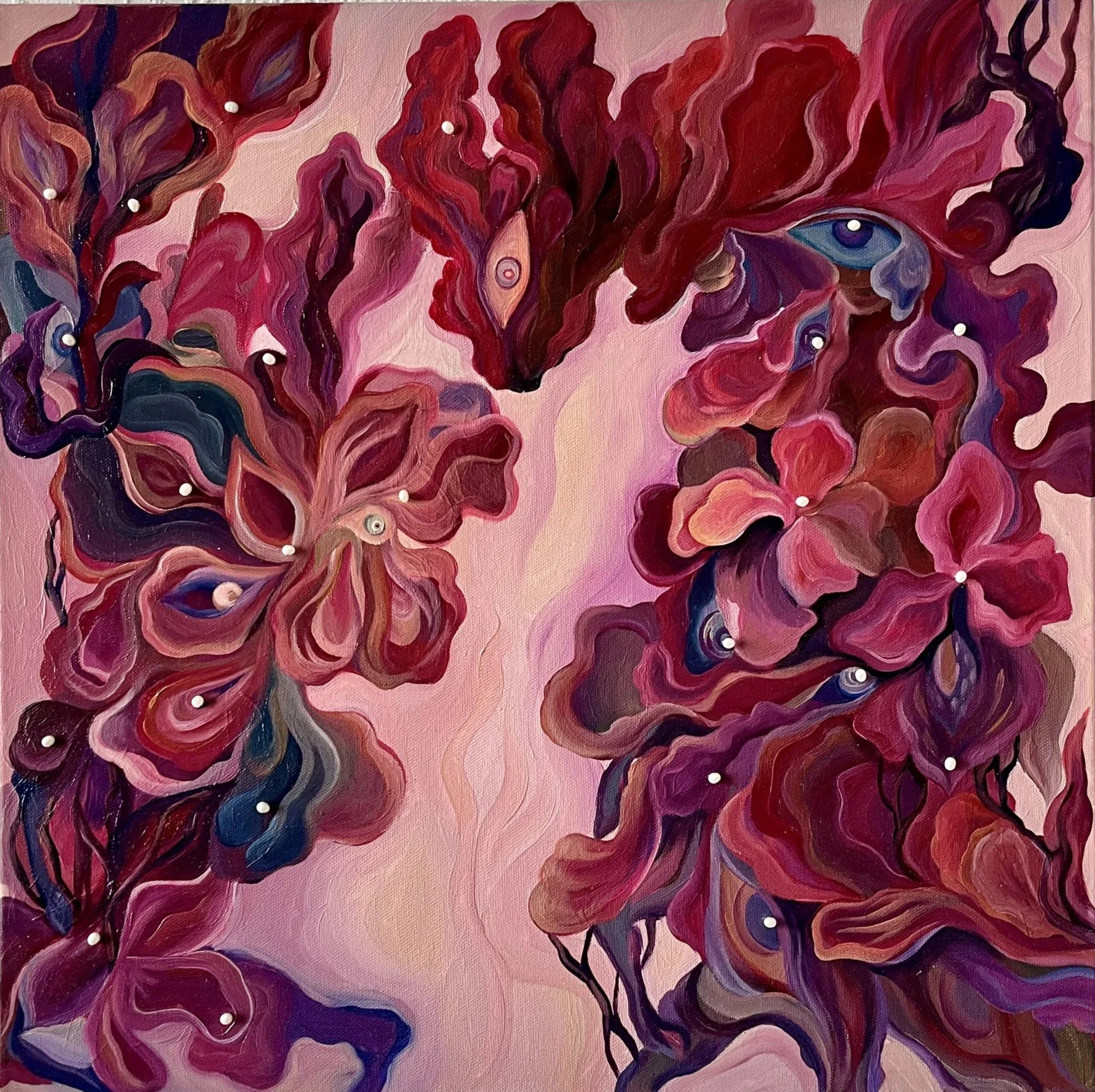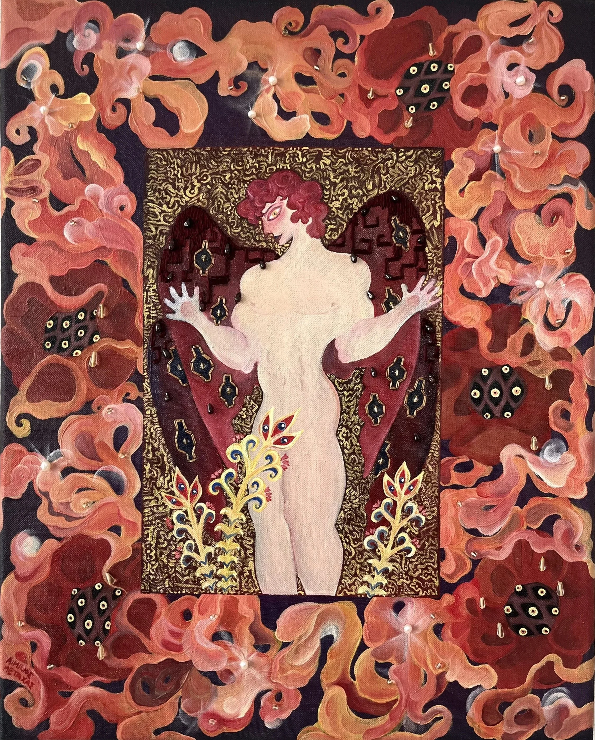 2025| 50x40 cm | oil, silk, pearls, garnet and citrine on linen